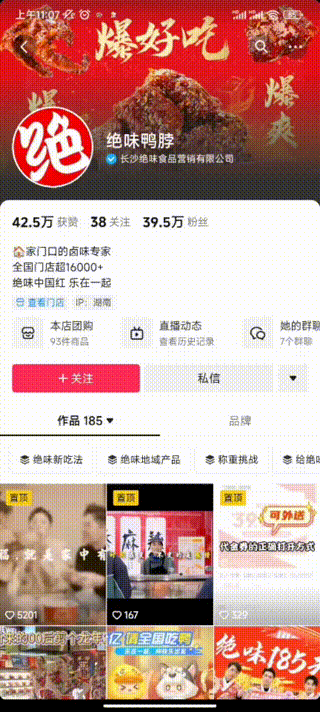 企業(yè)抖音藍v賬號展示——絕味鴨脖