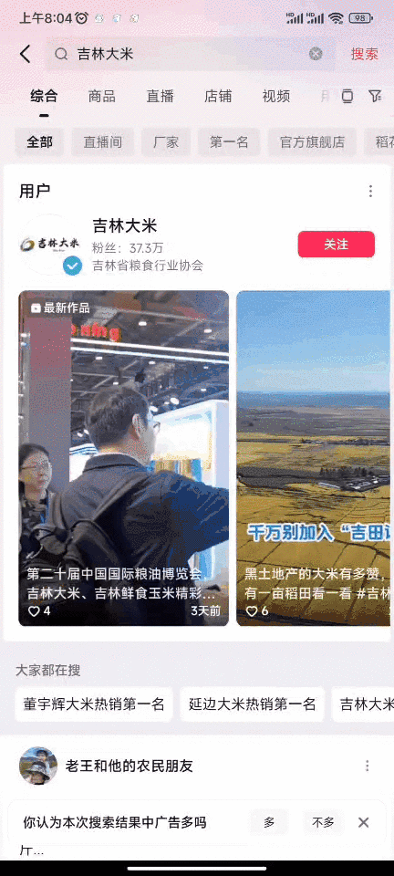 抖音藍(lán)V賬號在搜索結(jié)果中排名靠前,這為“吉林大米”帶來了更大的曝光量。藍(lán)V認(rèn)證的賬號在搜索結(jié)果中具有更高的權(quán)重,更容易被用戶找到。