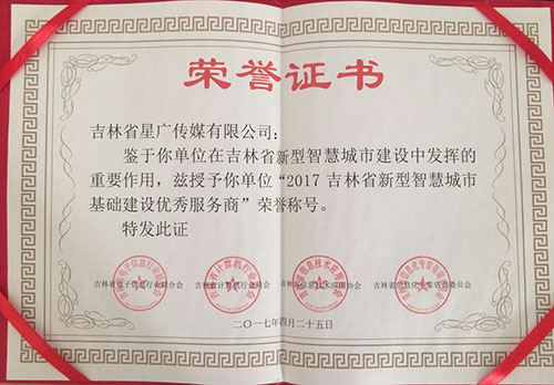 熱烈祝賀星廣傳媒榮獲“2017吉林省新型智慧城市基礎建設優(yōu)秀服務商”稱號